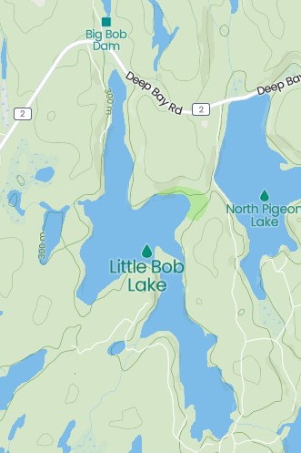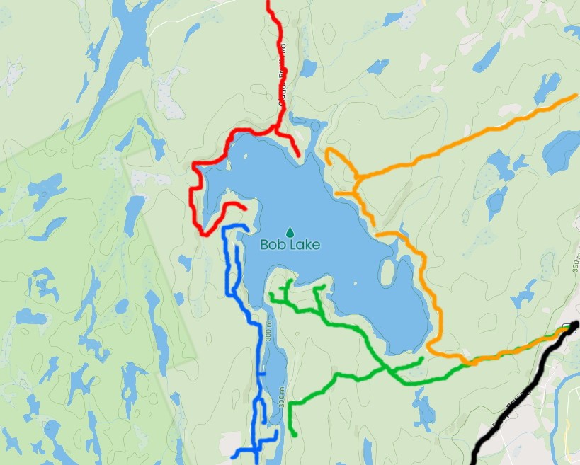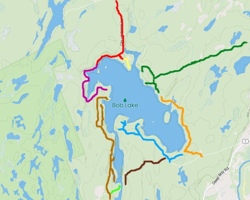 The development of a lake usually coincides with the development of the roads accessing it. Currently there are four road systems that provide access to Bob Lake as shown in the map below. River (Deep Bay) Road is marked in black.
