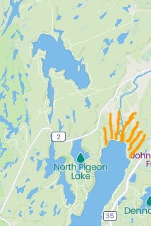 - North Bob Lake Affiliation (in purple) has 33 cottages on the west (private) part Claude Brown Road.