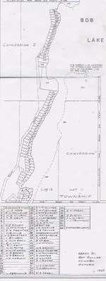 The body of water heading down towards the dam is definitely part of Bob Lake but since the start of cottaging it has been called “the river”. In the last 15 years or so, some cottagers and probably some real estate agents began to call it the “arm of the lake”. The first narrows is at the bottom of lot 11, concession II and the second narrows is at the bottom of lot 12, concession I.