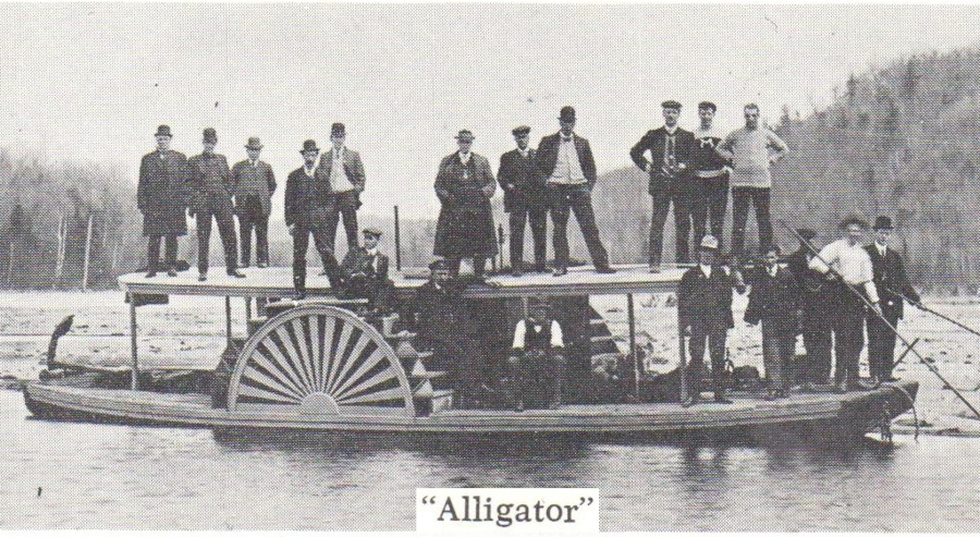 Alf was also a master carpenter and boat maker, and later that year he opened Minden Boat Works in the former Eastman’s Blacksmith Shop on Bobcaygeon Road. During his career, Alf’s business built steamboats, alligator logging boats (as shown at the top of this chapter), motor launches, and thousands of wooden canoes and skiffs. Larger boats were moved on rollers down to the Gull River to be launched. The company also made wooden pews for six county churches, including the United and Anglican churches in Minden. In 1947 Alf retired, and the shop closed a few years later. The building eventually became Sunny’s Variety Store, which closed in 2010 and was subsequently demolished.